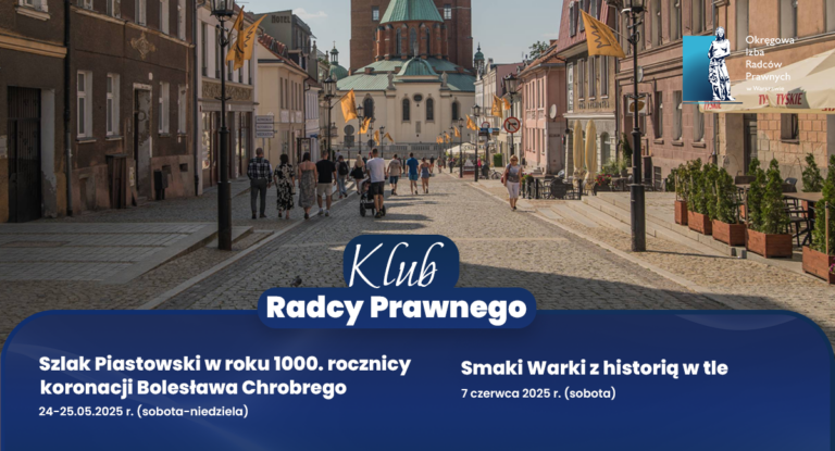 Klub Radcy Prawnego zaprasza wszystkich radców prawnych i aplikantów radcowskich wraz z rodzinami do udziału w dwóch ciekawych wycieczkach: „Szlak Piastowski w 1000. rocznicę koronacji Bolesława Chrobrego” (w terminie 24-25 maja 2025 r.) oraz „Smaki Warki z historią w tle” (w dniu 7 czerwca 2025 r.).