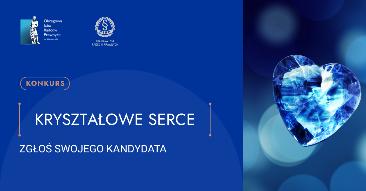 Krajowa Izba Radców Prawnych ogłosiła rozpoczęcie XVII edycji konkursu „Kryształowe Serce Radcy Prawnego”, którego celem jest uhonorowanie radców prawnych i aplikantów radcowskich wyróżniających się szczególną aktywnością społeczną i bezinteresowną pomocą na rzecz innych.